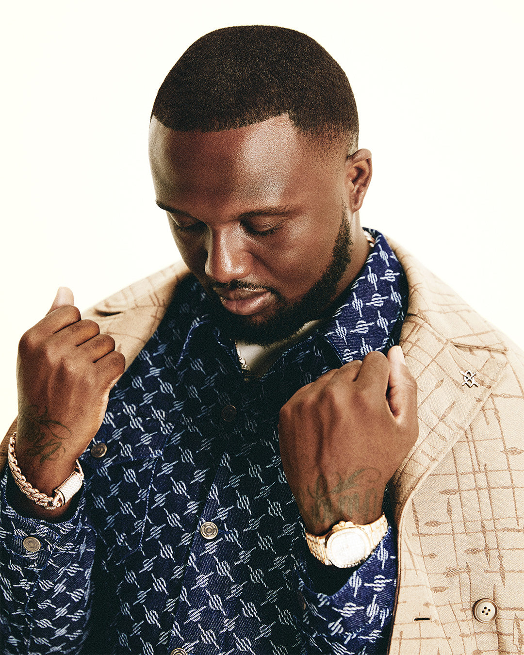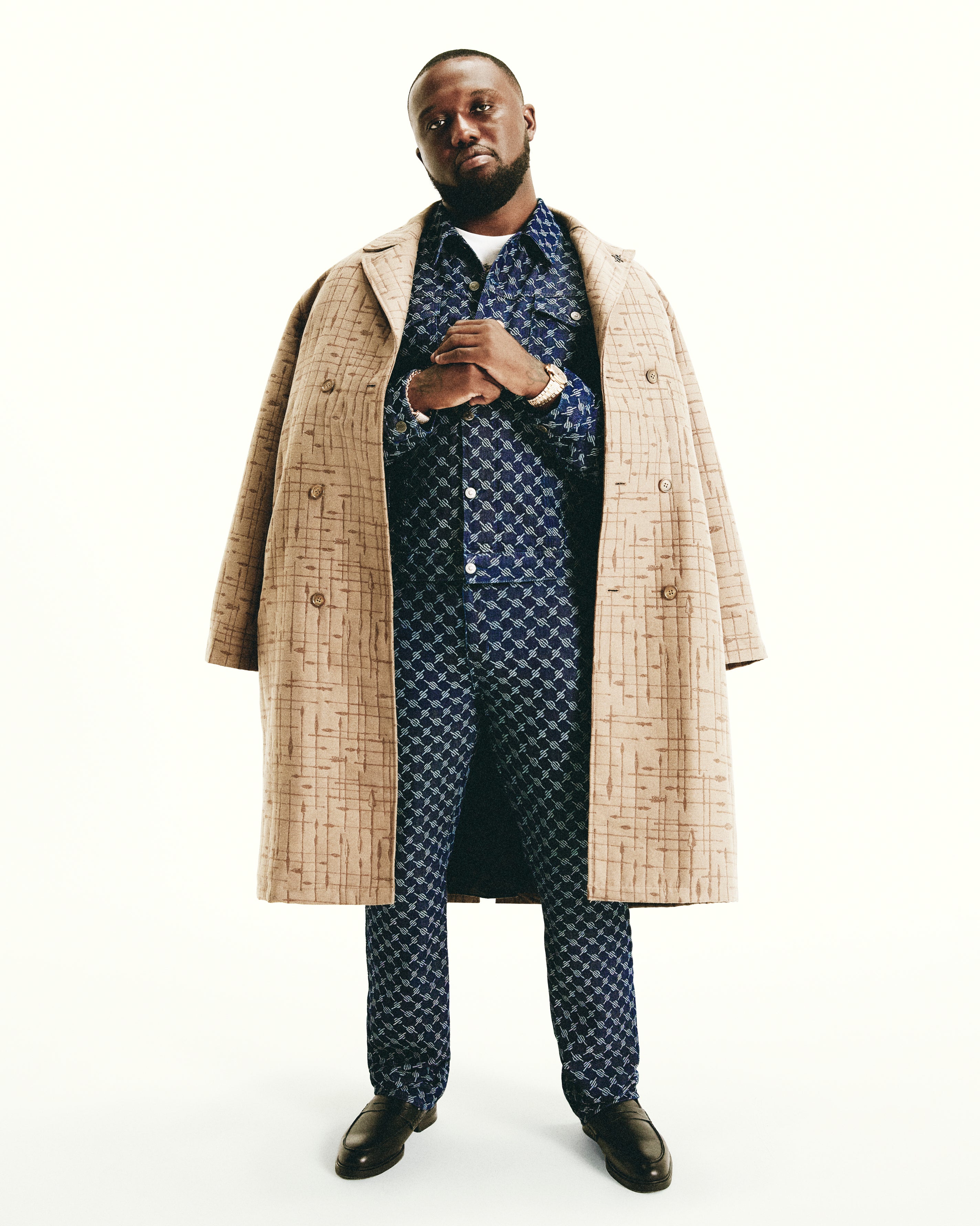 The new co-ords styles this season are the mid-grey denim covered with the brand's shield logo and the beige polo with long sleeves and pants. The monogram denim