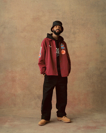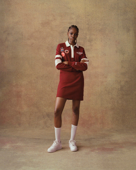 The capsule collection consists of 7 pieces in sandy and maroon colourways to create a uniform-esque aesthetic. The pieces are decorated with bold graphics portraying iconic instruments and the standout dual logo. A limited-edition online-exclusive varsity jacket is presented in a bordeaux and cream variation consisting of soft wool, leather sleeves, and custom patchwork embroideries. Also in the capsule collection are a classic coach jacket, a cosy-yet-preppy cream-coloured sweatsuit, a polo dress and a core hoodie. T-shirt staples all adorned with custom graphics and branded Daily Paper and Dreamville logos.