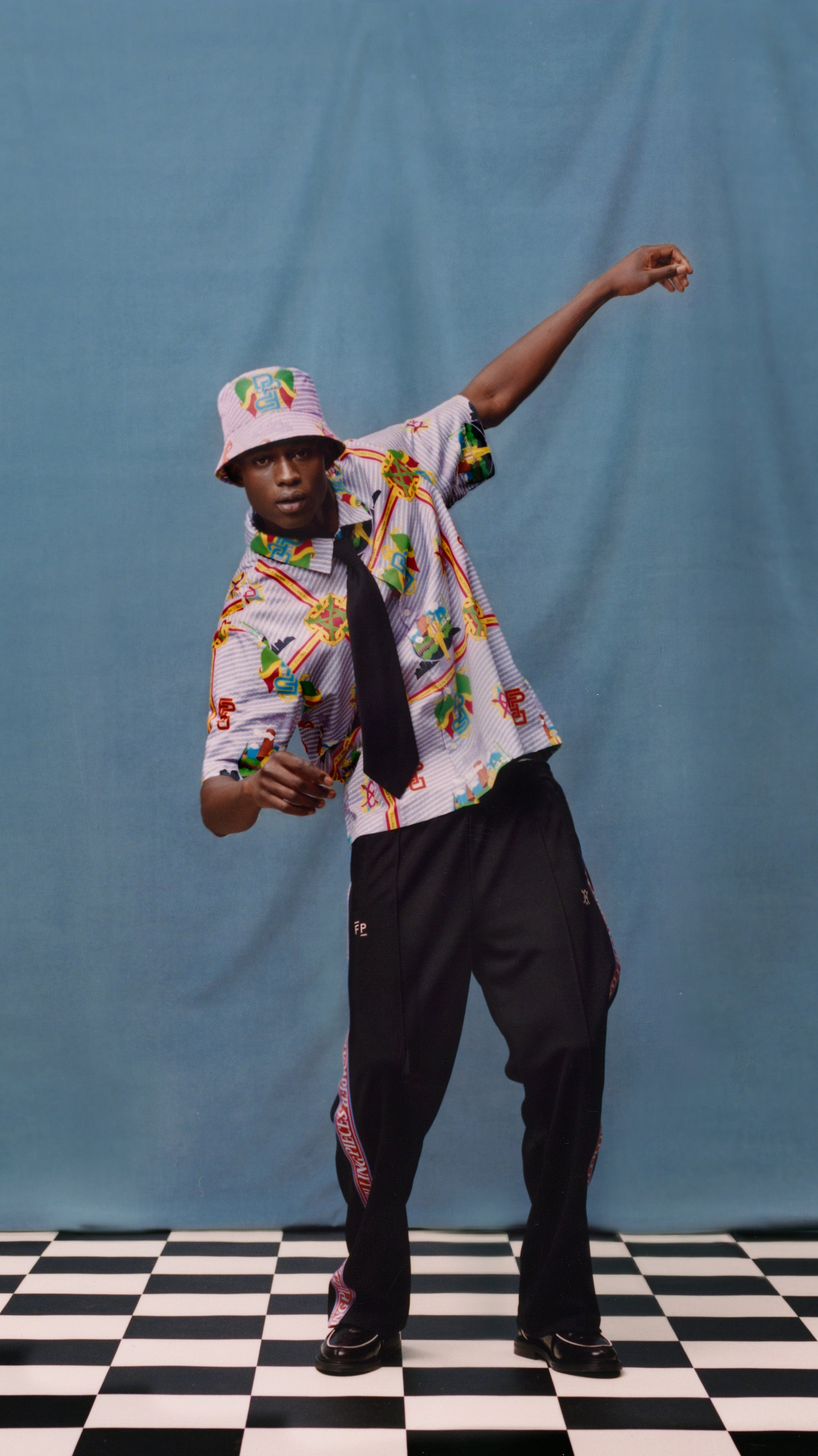 The collection's overall print is composed of the brands’ stylized logos, and insignia inspired by the founders’ heritage, alongside a graphic depicting a dandy Sapeur in his neighbourhood. With a nod to the Sapeurs’ flamboyance and elegance, the colour palette ranges from light blue and lilac to rich green, classic black and white and a surprising pop of yellow.