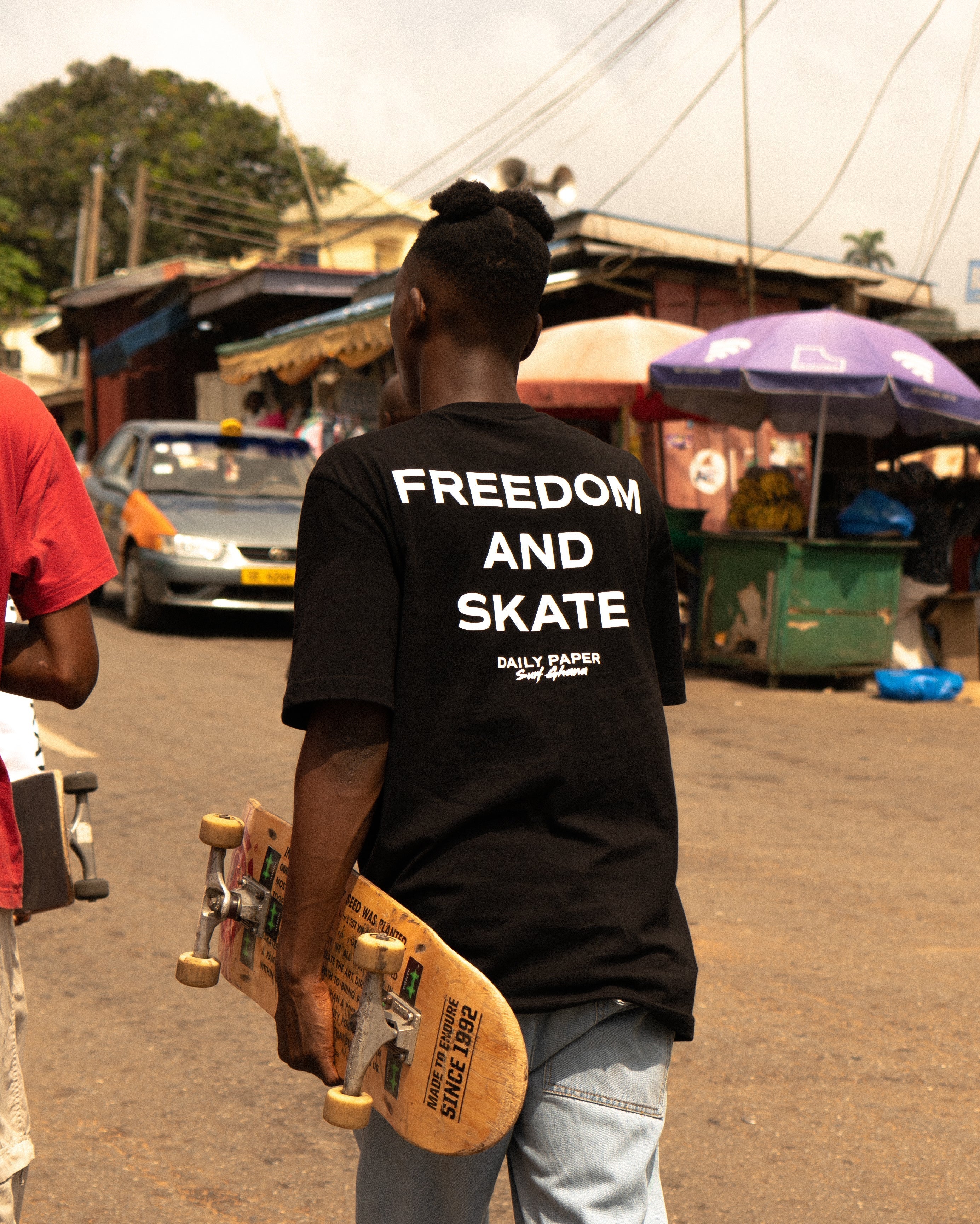 Our co-branded capsule with Surf Ghana also flipped signature Ghanaian emblems into powerful emblems for the grassroots skate movement across a T-shirt, a long-sleeved top, and a bucket hat. Made of 100 percent cotton, the Daily Paper x Surf Ghana pieces are emblazoned with “FREEDOM AND SKATE” text – a play on Ghana’s “Freedom and Justice” motto. All proceeds of both capsules went towards building the Freedom Skate Park in Accra, Ghana.