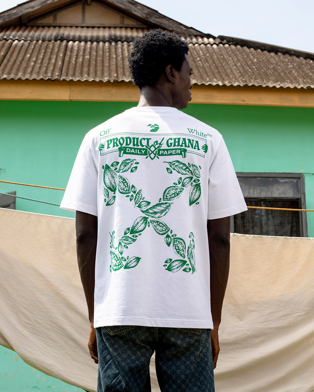 Comprised of two tees, with our Off-White™ collab we paid homage to Ghana’s longstanding cocoa harvesting tradition by reclaiming the industry’s “Product of Ghana” slogan. And Virgil Abloh’s signature arrow branding was adorned in cocoa pods and leaves. Appropriately, this collaborative tee was realized in “Decadent Chocolate” or classic white.