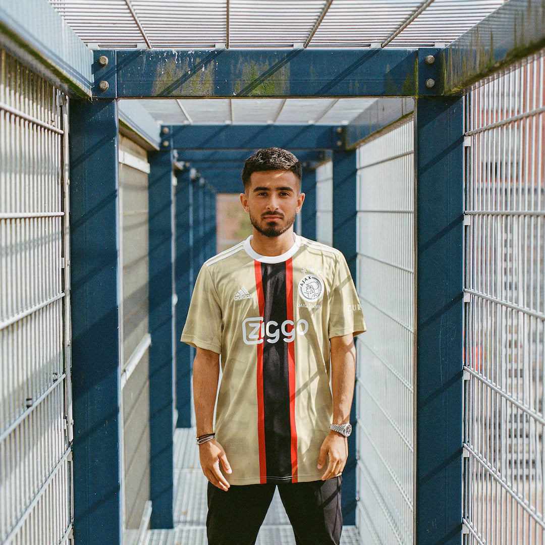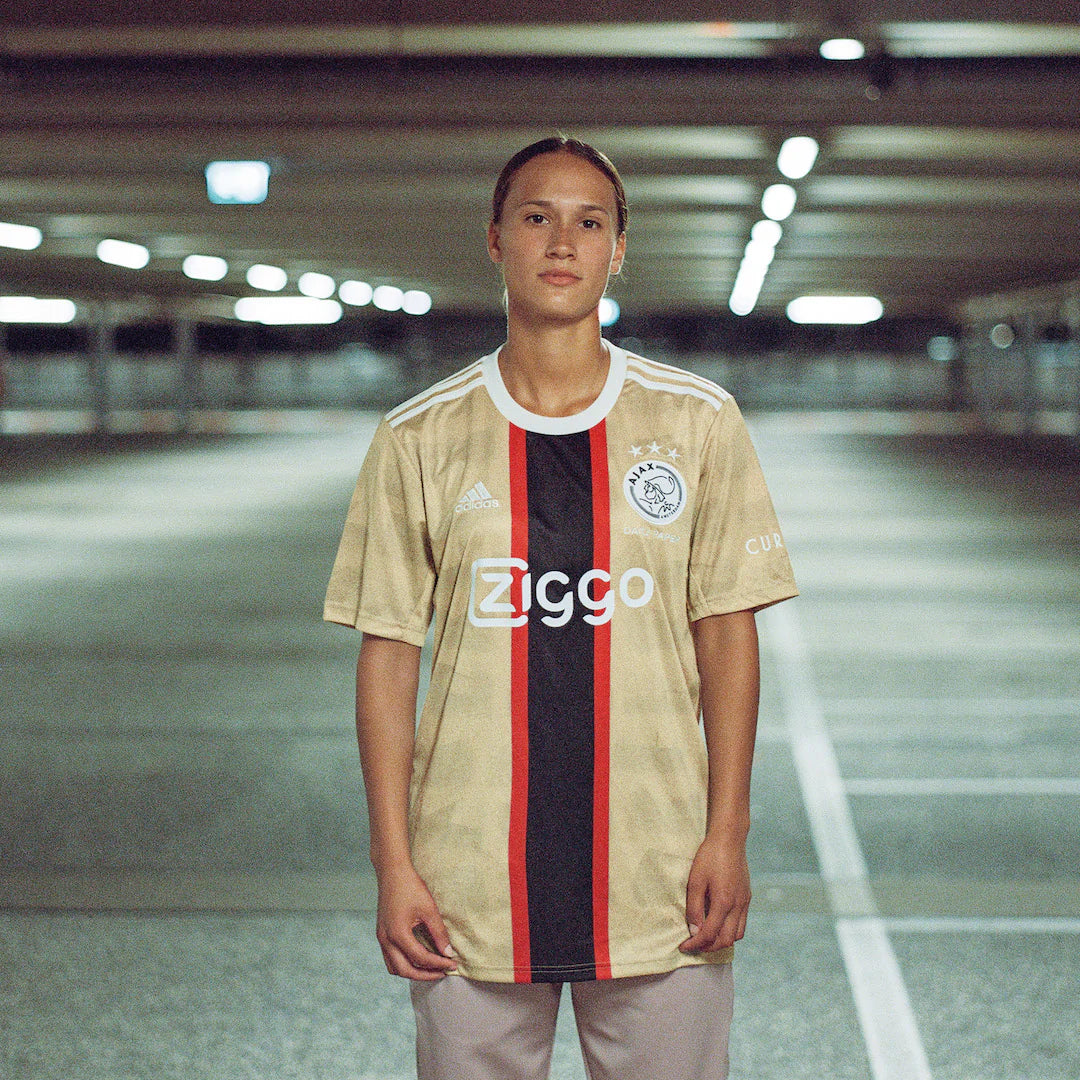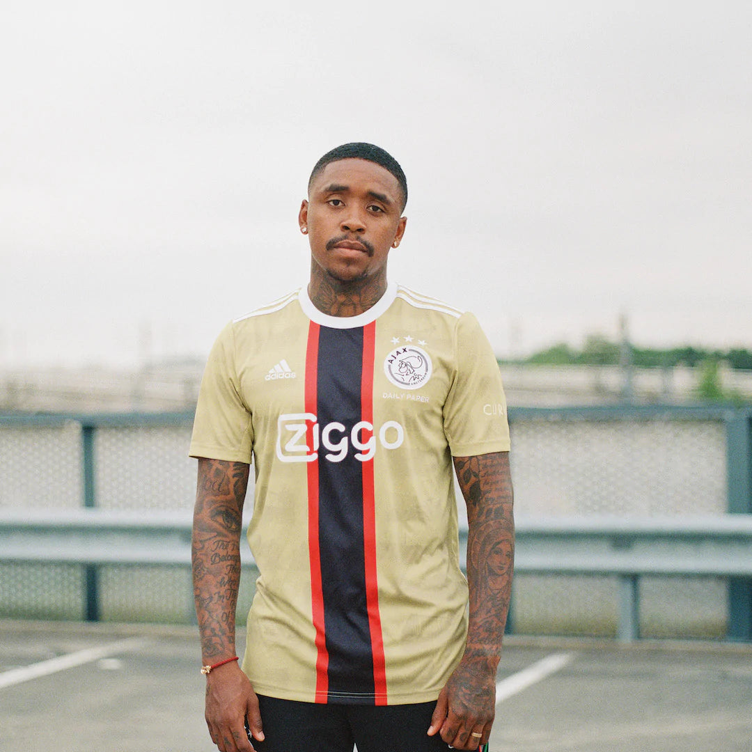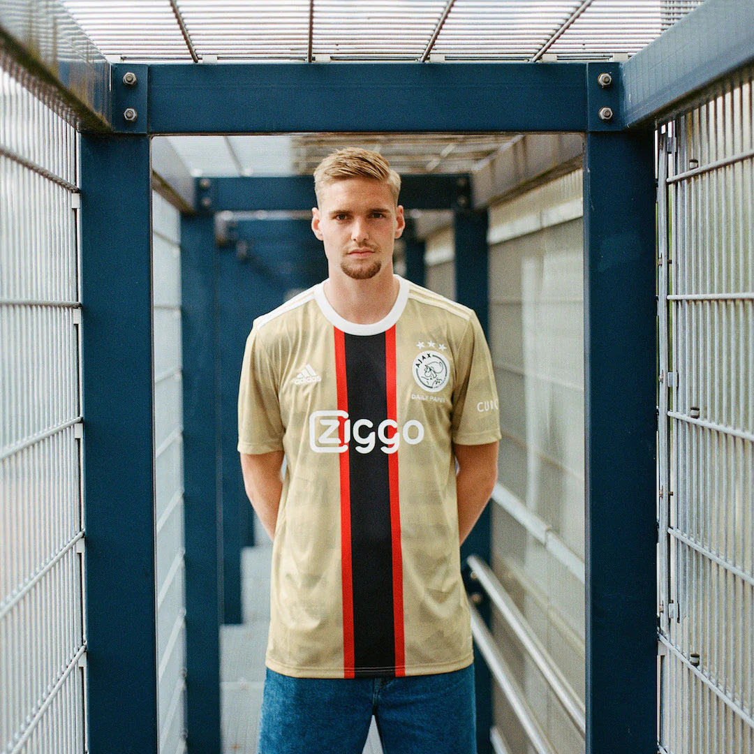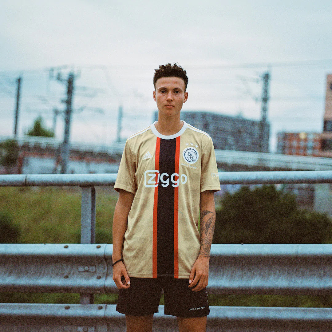 Today, Ajax, adidas and Amsterdam based fashion brand Daily Paper release the 2022/2023 Ajax third kit. The kit celebrates Amsterdam’s unique street football culture and its golden generation, to recognize its impact on the sense of belonging and community in Amsterdam. The predominantly golden jersey features smoky black watermarks of 10 of Amsterdam’s most prominent street football courts. The red and black vertical bar, and white Ajax crest and sponsor logos, reflects the colours of the loved city flag. It also mirrors the vertical red bar of the iconic Ajax home jersey.