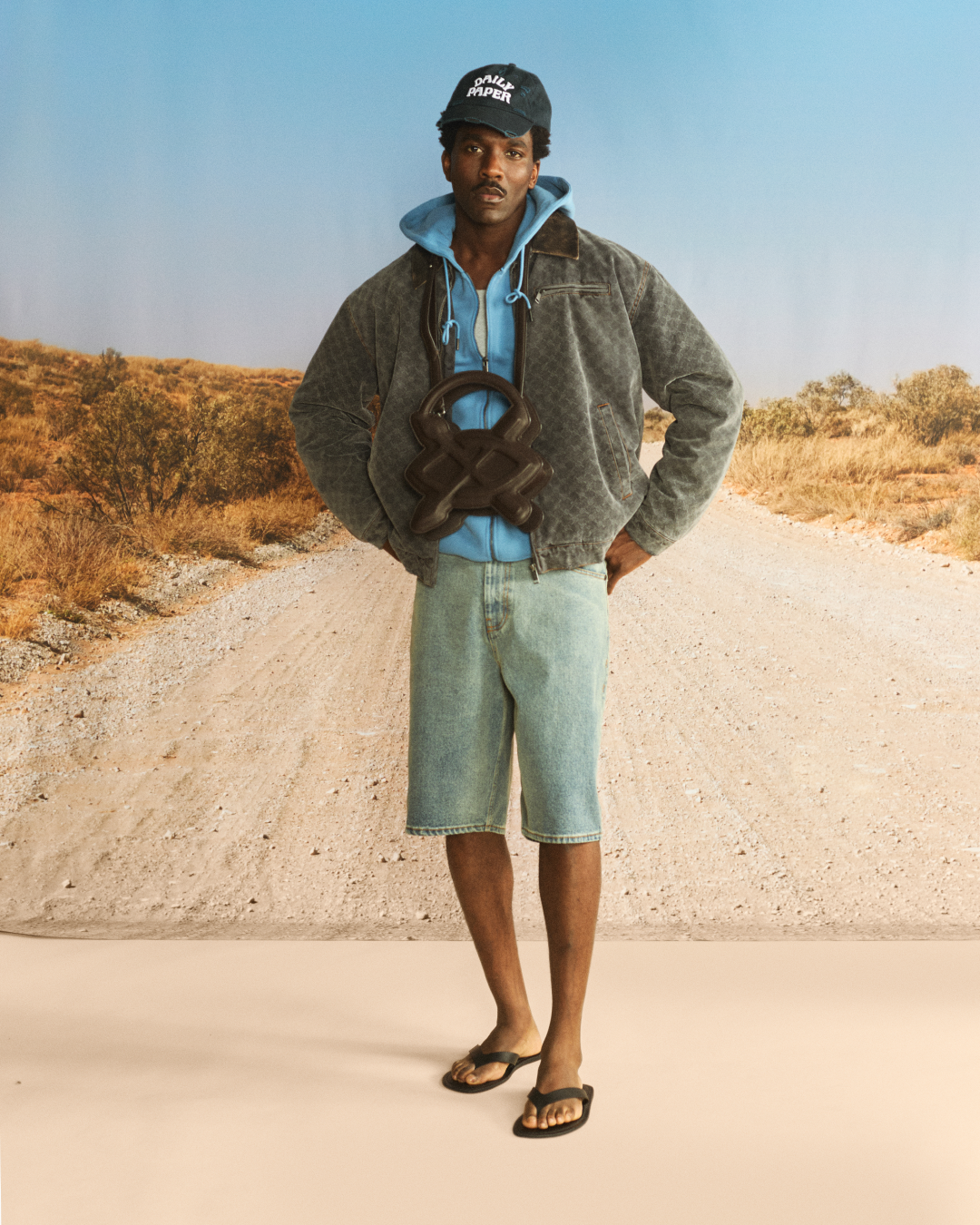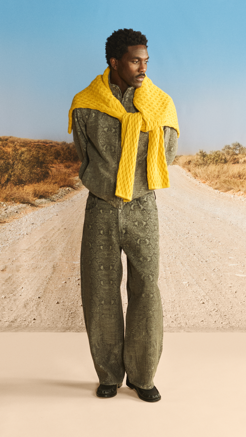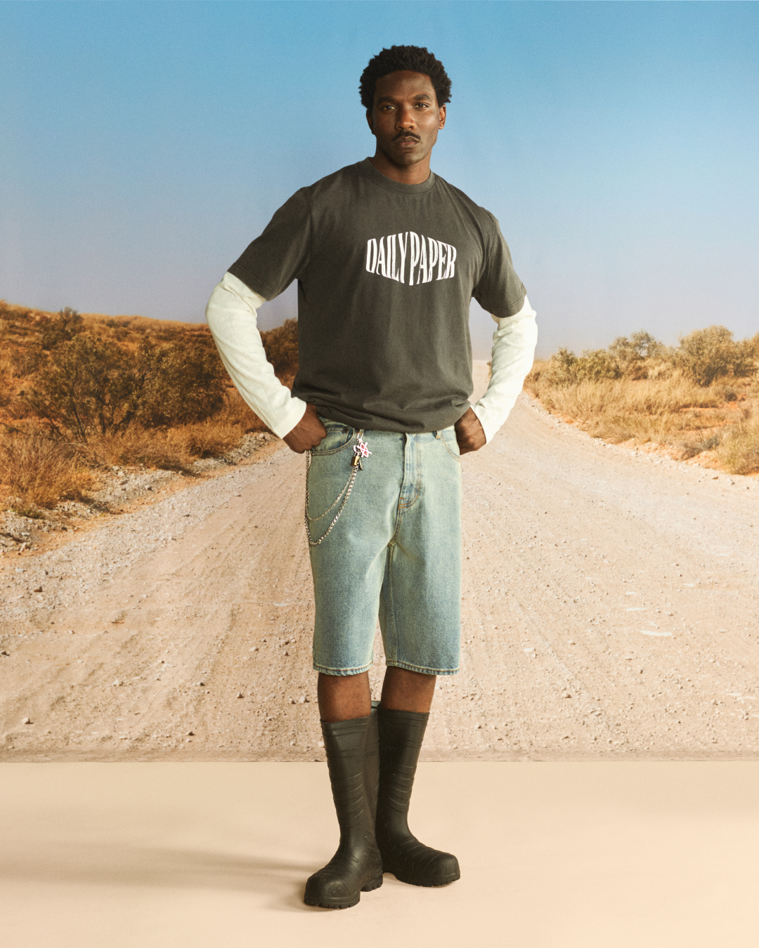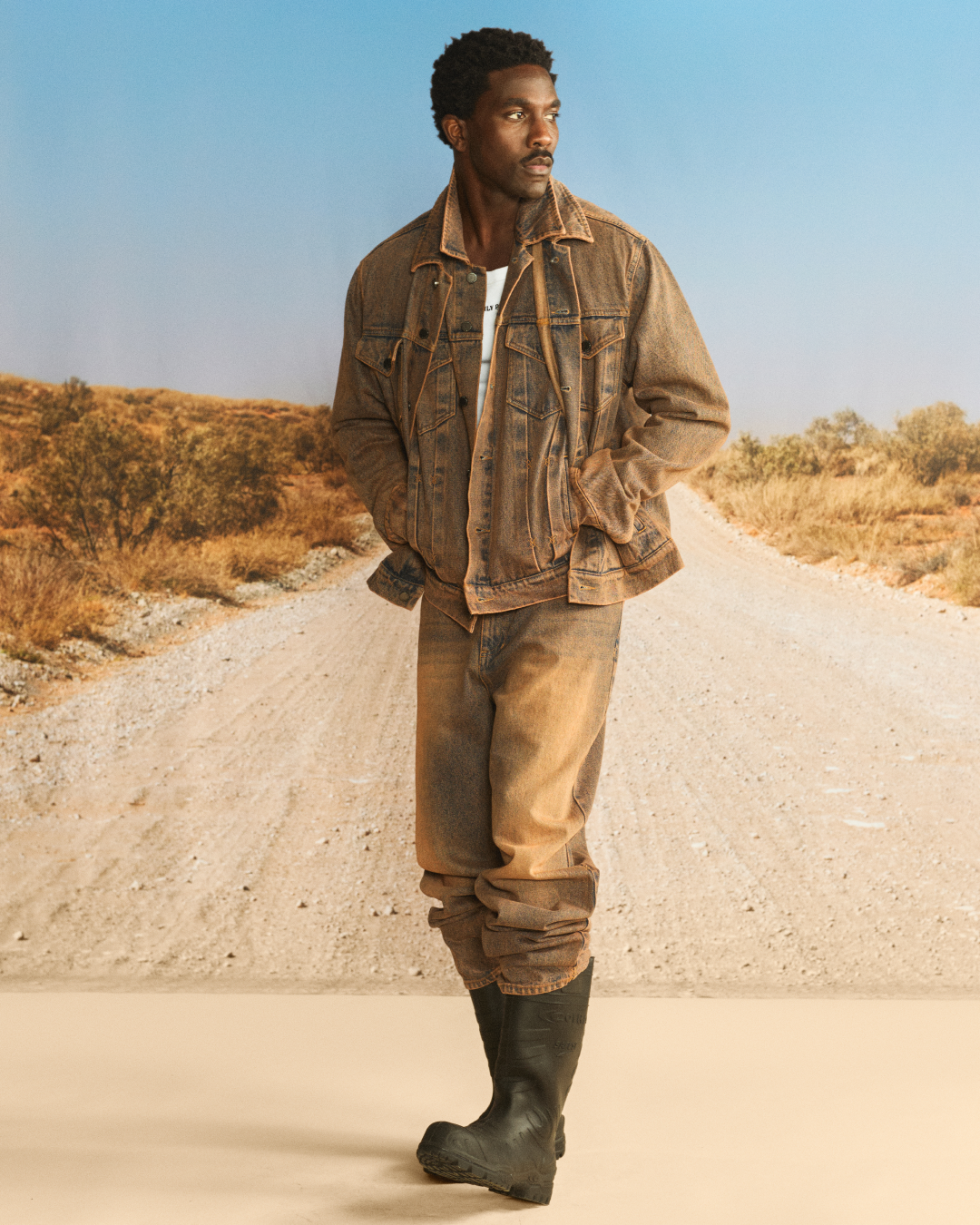“OFF ROAD” draws inspiration from those who choose to move beyond the expected and carve their own direction, choosing their own lane. This ethos of making more from what already exists at the heart of the collection, translating into washed textures, utilitarian silhouettes, and graphic treatments inspired by dust, desert tracks, and untrodden paths.
