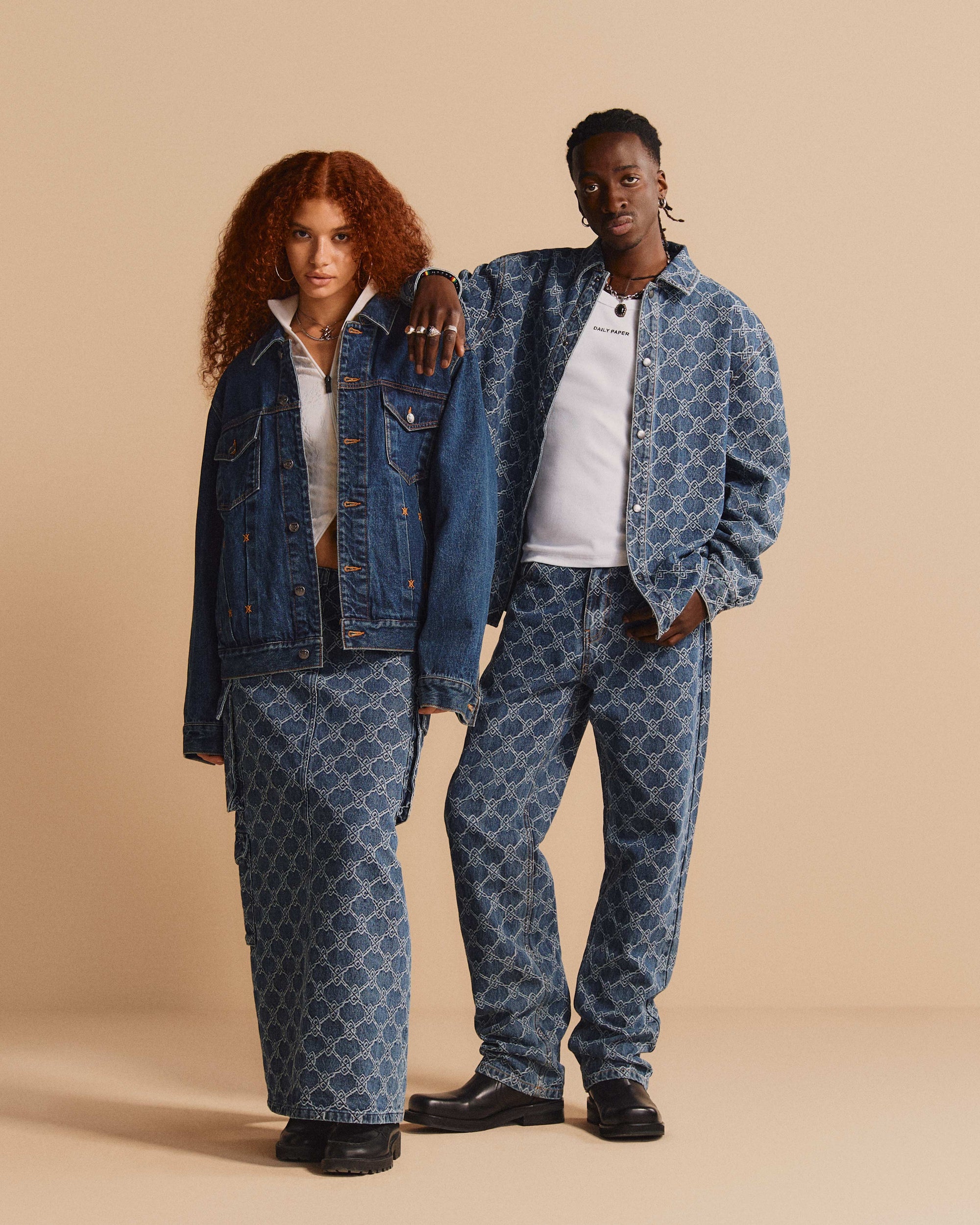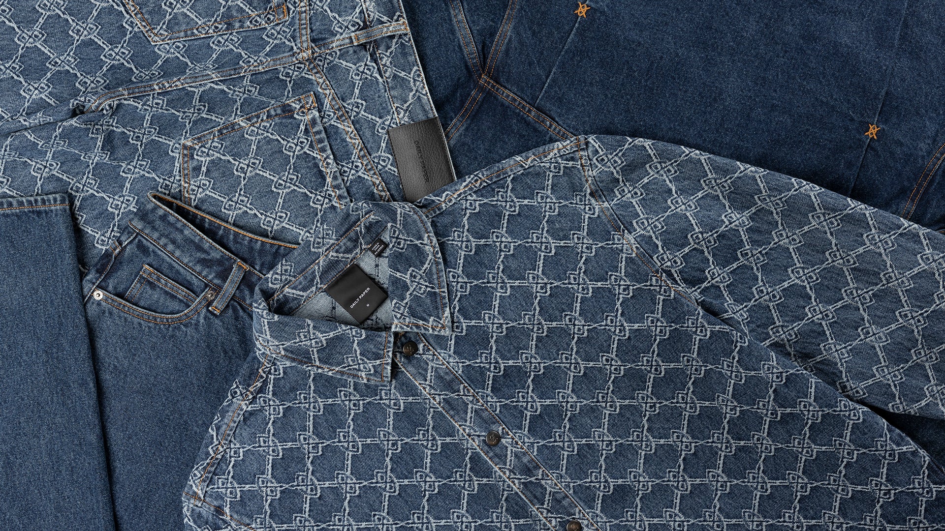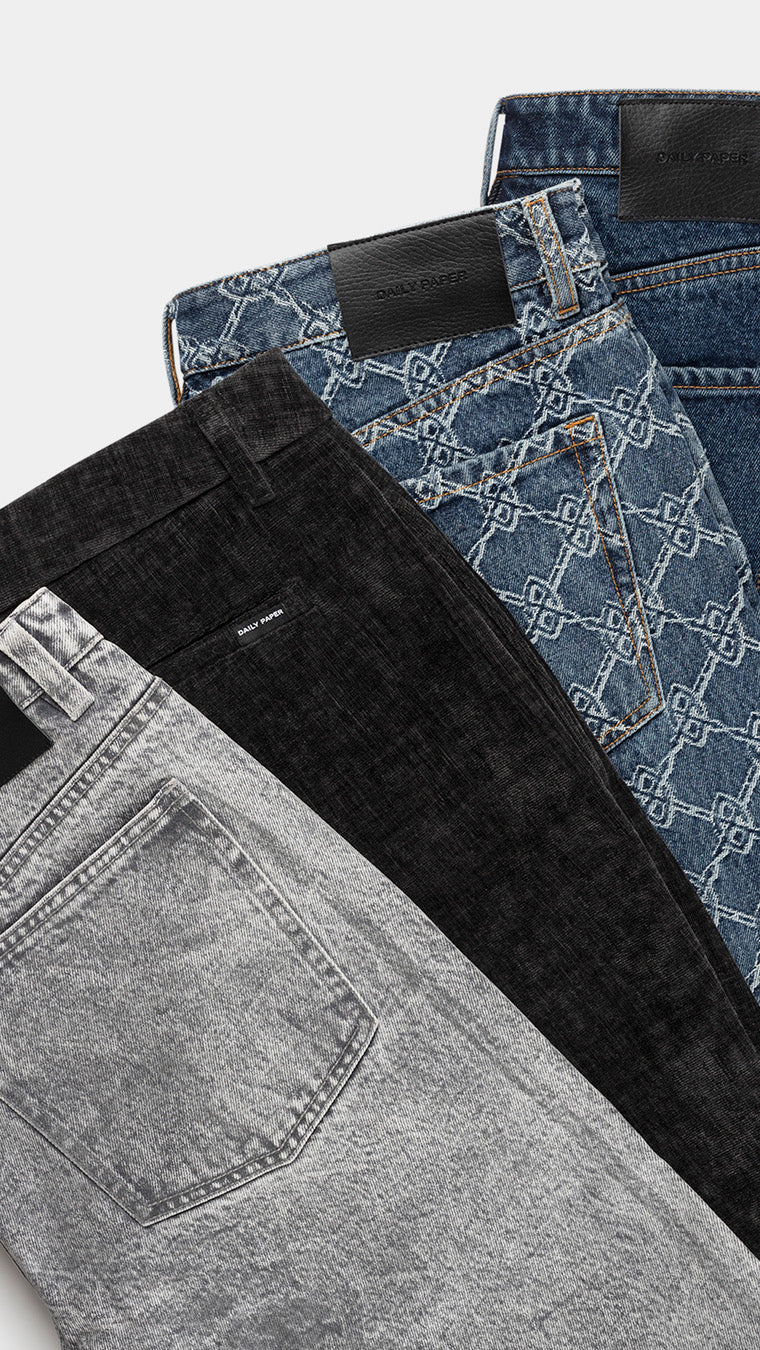 The monogram printed denims, a signature of the Daily Paper collection, are reimagined with a gradient colourway that adds a new angle to the monogram denim line. This subtle shift on the classic monogram denim line adds depth and dimension, offering a modern interpretation that remains inherently timeless.